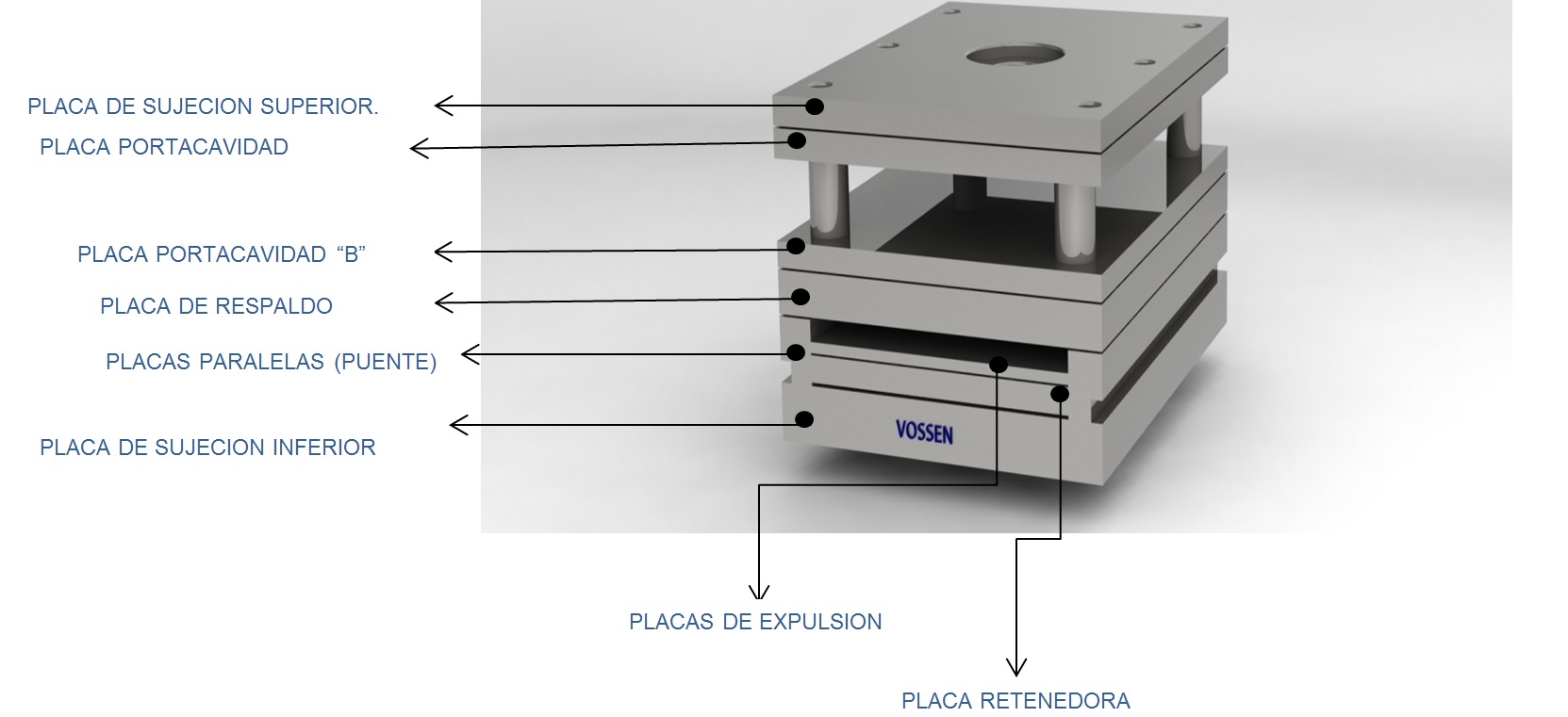 - Todos los portatroqueles se entregan ensamblados, para su fabricación se utilizan placas de acero A-36 o en algunos casos Acero 4140 T dependiendo de las necesidades de cada cliente, están equipados con postes fabricados en acero 1018 cementados y rectificados.